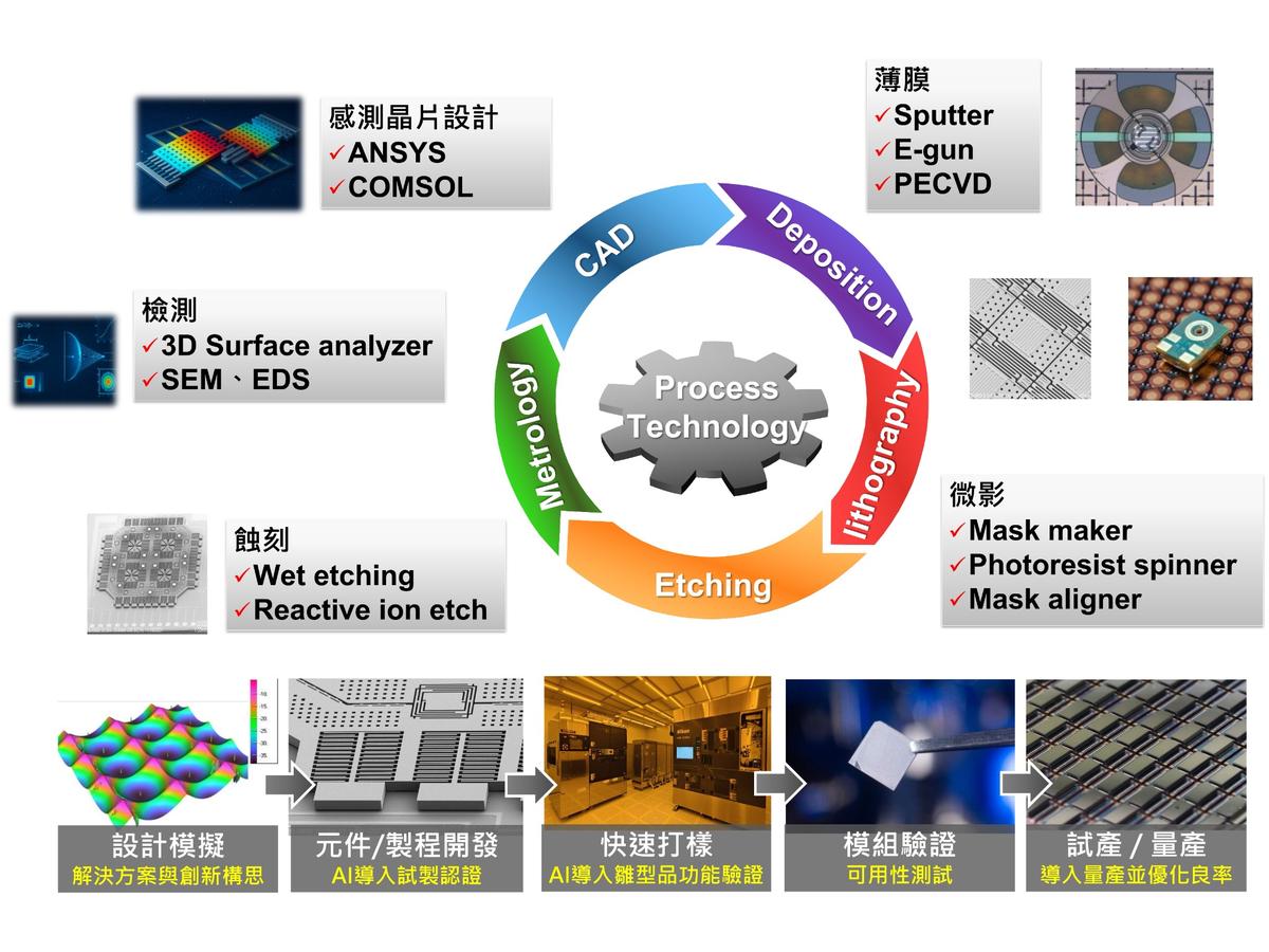 全球感測器的需求種類繁多且無所不在,為協助業者快速研發及突破挑戰切入高階感測器市場,經濟部特別支持工研院打造「先進半導體與感測晶片Infra建置計畫」,透過國內外相關資源鏈結,形成具備高度彈性的「快速試量產聯盟」。工研院主要關鍵核心為建置全國首座的「次微米感測晶片試產線」,透過感測晶片設計、微影、蝕刻、薄膜、異質材料製程整合、封裝與測試等關鍵製程之研發試製整合服務平台及智慧檢測流程,提供從設計驗證、雛型試製到小量試產的完整服務,並利用快速驗證回饋,有效縮短新產品的開發週期。
