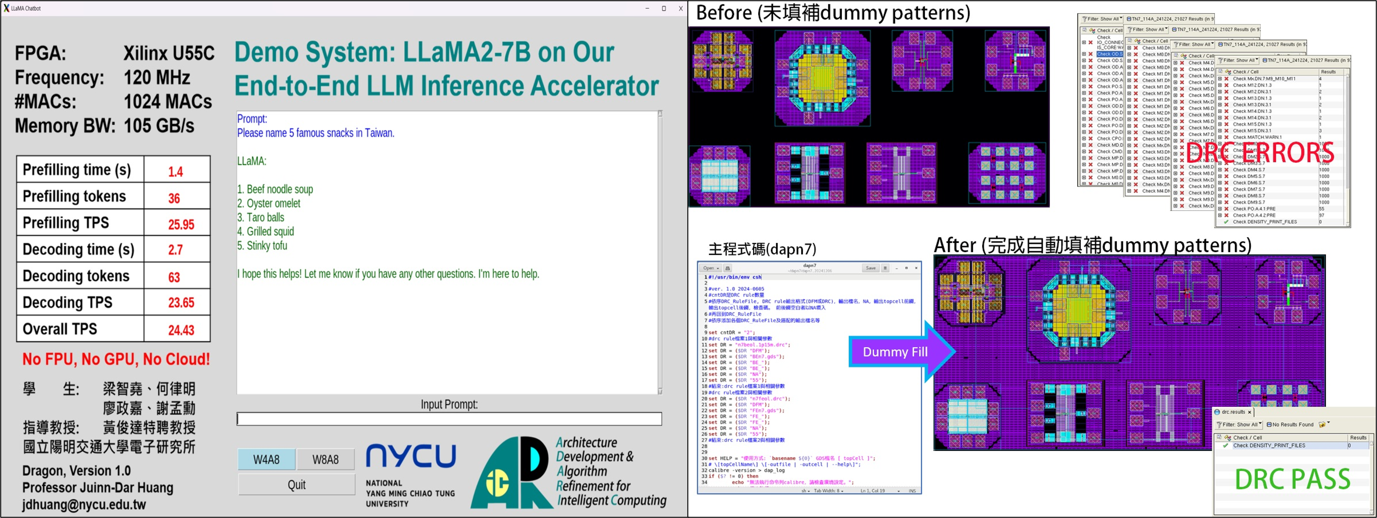 計畫執行迄今,引燃臺灣產學研豐沛前瞻技術能量,發展出多項具國際競爭力之晶片關鍵技術,例如國立陽明交大黃俊達教授團隊研發出針對邊緣運算應用優化之大型語言模型推論加速器晶片,實現10TOPS的高運算力,並可獨立完成推論過程中99.9%的計算;同時支援先進的混合精度計算技術,在每秒100GB記憶體頻寬下進行大型語言模型(Meta LLaMA2-7B)推論,每秒可產生高達24個詞元(token),展現出卓越推論效能與競爭力。