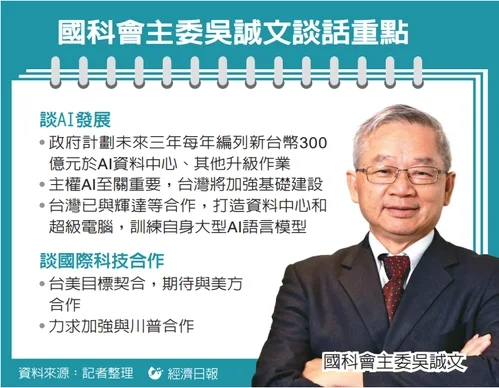國科會主委吳誠文接受日媒專訪時指出,台灣政府計劃在未來三年內將每年編列約10億美元(約新台幣300億元)於人工智慧(AI)資料中心和其他升級作業,同時力求加強與美國總統當選人川普的合作。
