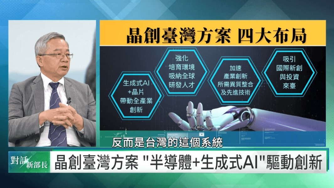 賴清德總統將新內閣定為成「行動創新AI內閣」,在最新一集的《對話新部長》中,邀請國科會主委吳誠文、台灣微軟公共暨法律事務總經理施立成以及香港大學中國商業學院客席副教授潘天佑,共同探討台灣未來要如何善用AI科技,吳誠文主委認為,賴總統提出「均衡台灣」的概念,不只是地域均衡,還包含產業均衡。台灣應該鼓勵年輕人新創非代工,未來會推動「晶創台灣計畫」將設計、整合到製造串起來。