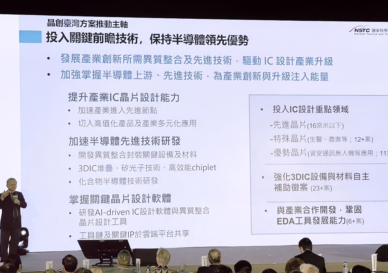 他並說,以台積電為首的半導體供應鏈,創造了台灣重要的經濟大動脈,政府投入的晶創計畫,則著重於發展先進技術,涵蓋提升IC設計能力、加速半導體先進技術研發(如異質整合封裝、3DIC堆疊、矽光子技術、高效能chiplet等),以及掌握關鍵晶片設計軟體工具。